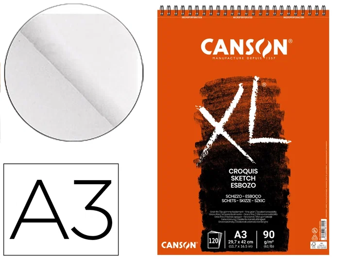 Canson Bloc de Dibujo Croquis A3 29.7x42 cm 120 Hojas, Microperforado, Grano Fino, 90 g/m²