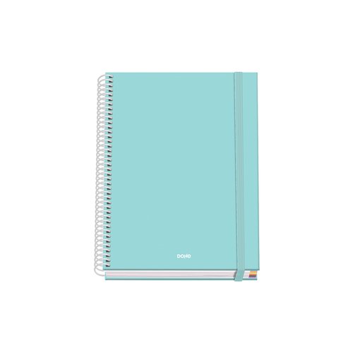 Cuaderno de tapa dura en cartón forrado con papel impreso y plastificado mate. Guardas impresas. Espiral metálico blanco y cierre de goma elástica plana de color pastel. Interior de 100 hojas microperforadas, en papel offset de 90 gramos, 2 taladros y cuadrícula de 5 mm con banda de color en tono pastel. Certificado FSC Mixto. Tamaño: 210 x 162 mm.