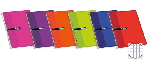 Bloc de tapa blanda de cartón de 400gr./m2 plastificado. Reverso gris. Contracubierta en cartón de 500gr./m2 estucado blanco. Papel blanco 60 gr./m2 con la intensidad perfecta de rayado y con margen. 6 colores surtidos. Encuadernado con espiral de alambre negro con coil-lock. Tamaño cuarto: 155 x 215 mm.