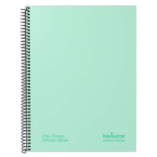 Cuaderno con espiral negra y cierre coil-lock, tapa extradura con tacto suave y acabado mate, guarda extragruesa negra impresa en plata, 120 hojas microperforadas con 4 taladros y 5 bandas de color a juego con la gama, en papel de 80g/m² Premium Writing navigator, y rayado cuadriculado en azul con cabecera y logo Navigator. Todo en papel certificado FSC®.