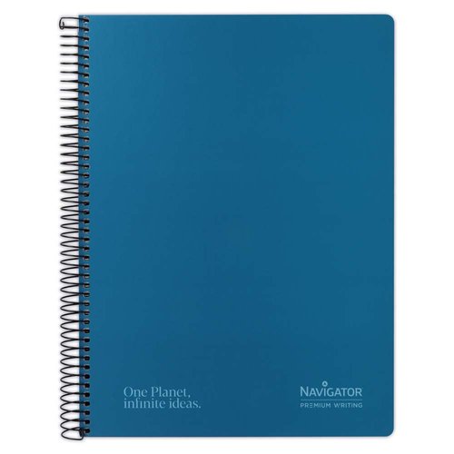 Cuaderno con espiral negra y cierre coil-lock, tapa contracolada con tacto suave y acabado mate, guarda extragruesa negra impresas en plata, 80 hojas en papel de 80g/m² Premium Writing navigator, y rayado cuadrícula 4x4 mm en azul con cabecera y logo Navigator. Todo en papel certificado FSC®.