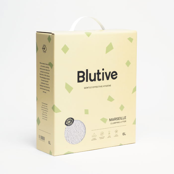 Las arenas aglomerantes Blutive son de bentonita 100% natural, sin componentes tóxicos. Su embalaje está hecho con cartón reciclado y libre de plásticos.