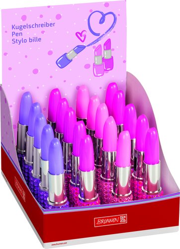 Expositor de bolígrafos con tapa, que emulan una barra de labios de 100 mm. Tinta color azul y exterior en 3 colores surtidos (rosa, violeta y fucsia).