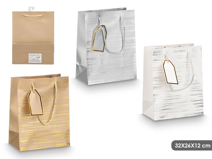 BOLSA ASA LINEAS SURTIDOS COL METALICOS 32X26X12CM