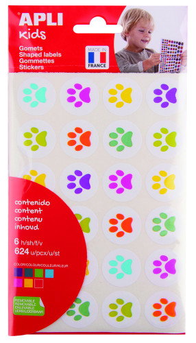 "BOLSA DE GOMETS EN FORMA DE HUELLAS DE GATITOS EN TAMAÑOS Y COLORES SURTIDOS: VERDE OSCURO, ROJO, VERDE, AZUL, AMARILLO, LILA Y ROSA. CADA BOLSA CONTIENE 6 HOJAS CON 288 GOMETS.