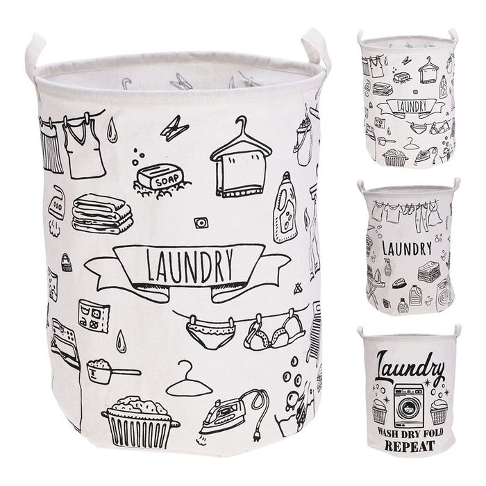 Saco para colada con aro de polipropileno, ø40 x 50 cm, revestido interiormente, con dos asas, blanco con 3 diseños surtidos en negro