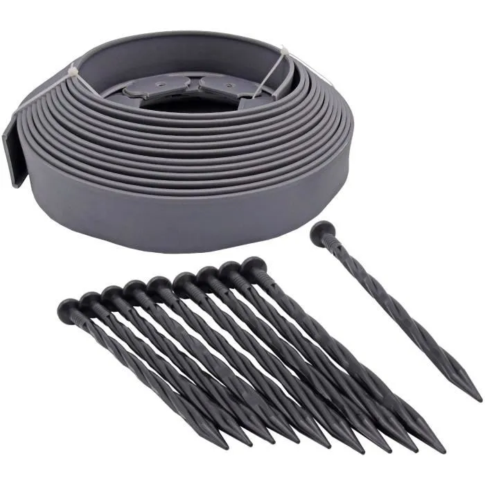 Borde de césped - NATURE - Gris - Rollo - PE espesor 4 mm - H5 cm x 10 m - 10 clavos retorcidos negros - H20cm x 8 mm