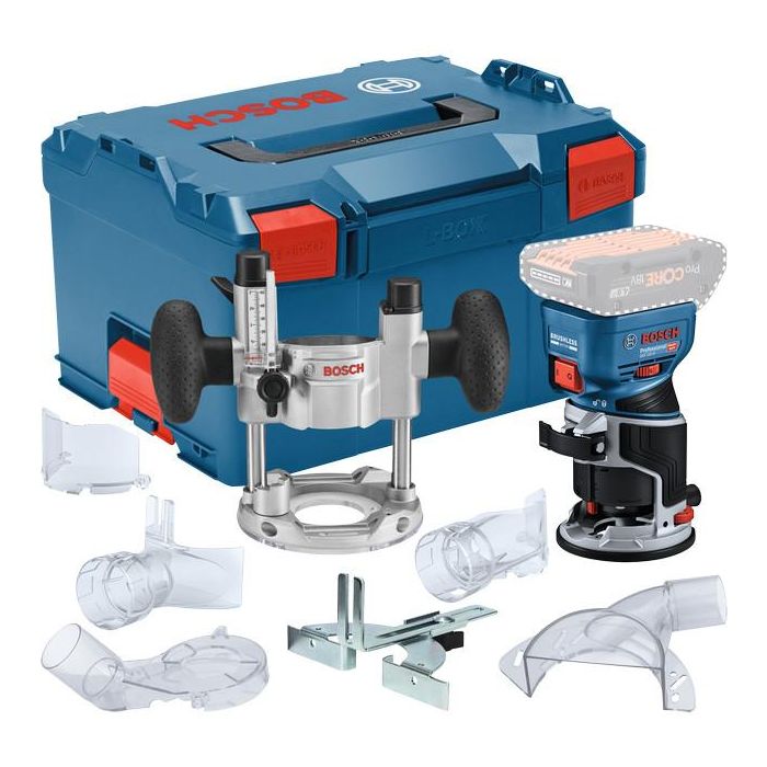 Bosch GKF 18V-8 Fresadora de cantos a batería 18V, 30000 RPM, velocidad ajustable, portaherramientas 6/6.35/8 mm, con luz integrada y adaptador de polvo