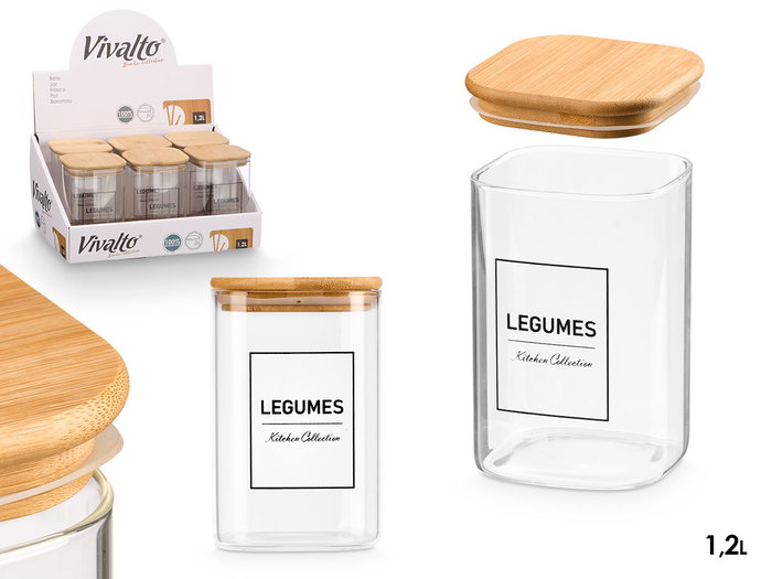 BOTE CUADRADO BOROSILICATO TAPA BAMBU LEGUMES 1,2L