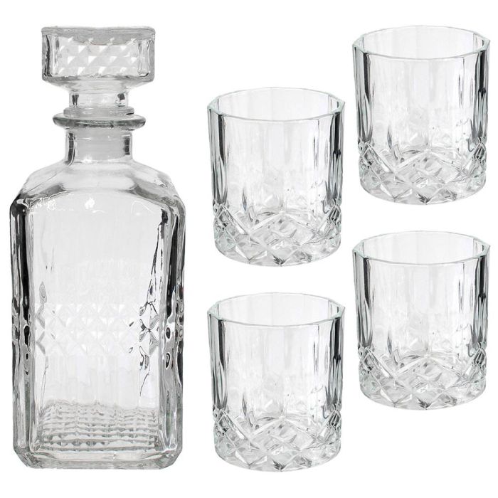 - Presenta y sirve tu whisky en este set que consta consta de 4 vasos y una botella de vidrio.