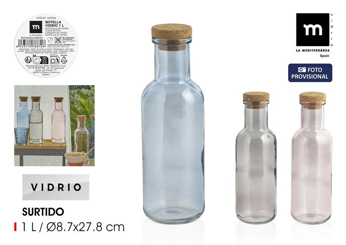 La Mediterran Botella de Vidrio Lisa con Tapón de Corcho Pintado 1L (8.7x8.7x27.8 cm) (24 Unidades)