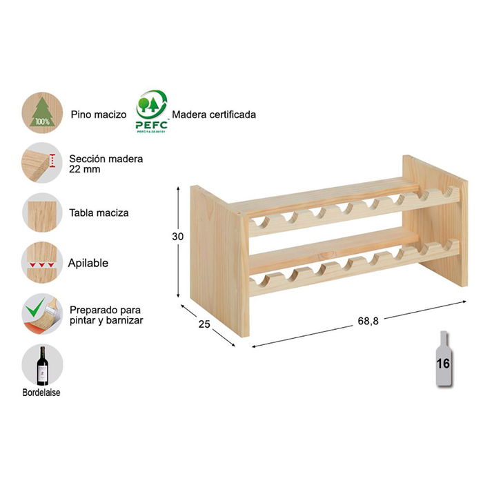 Botellero pino macizo merlot 16 botellas 68,8x25x30cm astigarraga
