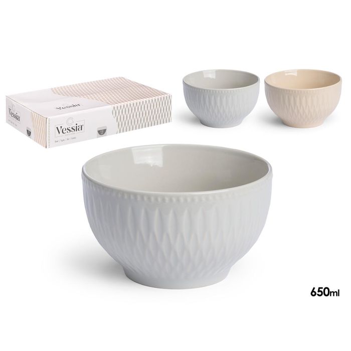 Vessia Bowl de Desayuno de Cerámica Surtido en 2 Colores Claros (Beige y Gris) 650 ml - 14.3 x 14.3 x 8.5 cm (Set de 24)