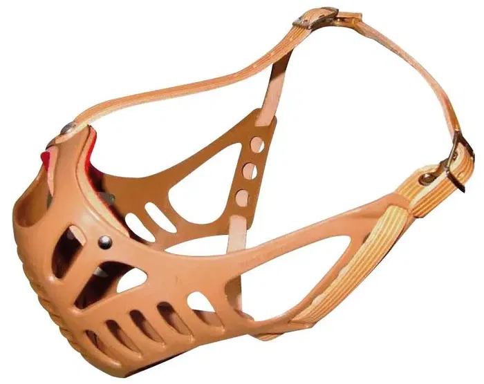Bozales de plástico especialmente diseñados para el hocico corto y grueso de los perros molosoides. Muy resistente y de fácil aplicación, con cierre de correa de cuero. Marca: Henry Schein.