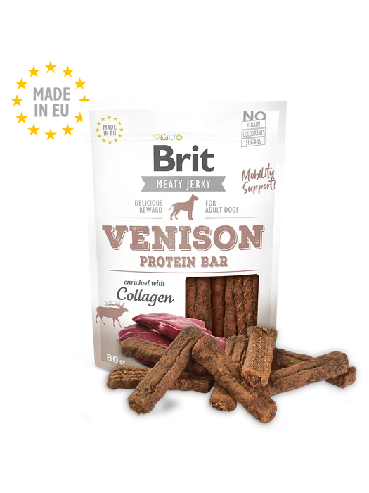 Elaborada por la marca Brit, conocida por sus productos de alimentación para mascotas de gama alta, esta barrita representa una extensión de su compromiso con ingredientes seleccionados, aunque en este caso formulado como un snack proteico para consumo humano. El sabor a venado ofrece una alternativa sabrosa y diferente a las barras proteicas convencionales.