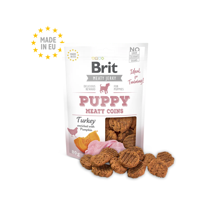 Disfruta de Brit Jerky Snack Puppy Meaty Coins con Pavo, un delicioso snack para cachorros en formato de monedas carnosas. Elaborado con pavo de alta calidad, este snack de 80 gramos es perfecto para premiar a tu cachorro durante su crecimiento. Brit ofrece la calidad y confianza que tu mascota merece.