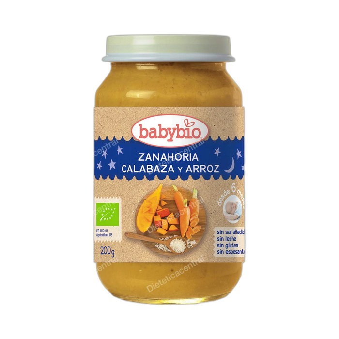 Zanahorias*, agua de cocción, calabaza*, arroz*, cebollas*, aceites vegetales* (colza*, girasol*), romero*. *Ingredientes procedentes de la agricultura ecológica