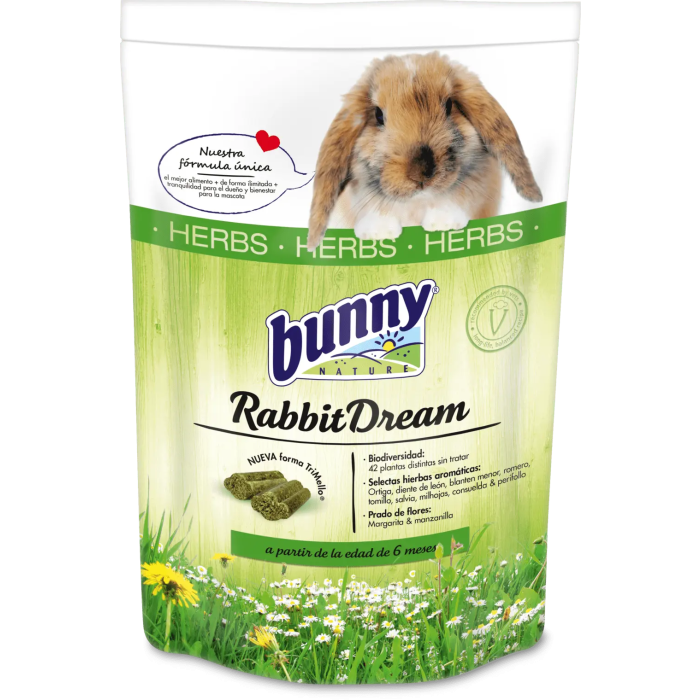 Alimento completo y equilibrado de alta calidad para conejos enanos, formulado con una mezcla seleccionada de hierbas para promover la calma y el bienestar.