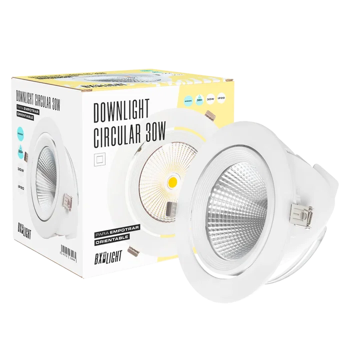 El Foco Downlight LED 30 W [BX3-30W-G-CW] de BX3 Light es una luminaria empotrable orientable de alto rendimiento, diseñada para proporcionar una iluminación potente, uniforme y confortable en espacios interiores con exigencias visuales elevadas. Con un índice de deslumbramiento UGR < 17, este modelo garantiza comodidad visual y baja fatiga ocular, ideal para entornos de trabajo exigentes.Características técnicas principales Potencia nominal: 30 W Flujo luminoso: 3.000 Lm Temperatura de color: 6.000 ºK (blanco frío) Dirección de luz: Orientable, permite ajustar el haz lumínico según necesidades del espacio Índice de deslumbramiento: UGR < 17, diseño óptico antideslumbrante Diseño: Empotrable con marco ajustable Vida útil estimada: 50.000 h Eficiencia lumínica: alta eficiencia con reparto uniforme de luz Factor de potencia: alto para minimizar pérdidas (detalles según configuración) Instalación: Empotrar en techo con resortes de retención Rendimiento y confort visual UGR < 17: cumpliendo requisitos de confort lumínico para oficinas, despachos u otras zonas donde se busca reducir el deslumbramiento y favorecer la concentración. Haz ajustable: permite orientar la iluminación hacia zonas específicas o elementos de interés. Distribución uniforme: óptica diseñada para aportar luz homogénea sin zonas oscuras. Aplicaciones recomendadas Oficinas, salas de reuniones y espacios corporativos Recepciones y zonas de atención al público Tiendas y espacios comerciales Aulas, centros educativos y bibliotecas Pasillos y zonas comunes con exigencia visual Ventajas clave Luz potente y eficiente: 3.000 Lm con bajo consumo de 30 W Control del deslumbramiento: UGR < 17 para confort visual superior Orientable: flexibilidad para dirigir la luz según necesidades del proyecto Diseño empotrable estético: integración limpia en techos modernos Larga vida útil: hasta 50.000 h de funcionamiento fiable