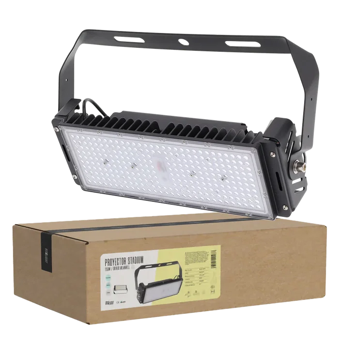 El Foco Proyector LED 250 W Stadium de BX3 Light es una luminaria de alto rendimiento diseñada para alumbrado deportivo profesional y grandes áreas exteriores, que combina potencia, eficiencia lumínica, robustez y versatilidad de uso. Equipado con LEDs Philips 3030 de alta eficiencia y un driver Meanwell regulable 1-10V, este proyector ofrece un control preciso de la intensidad lumínica según las necesidades de cada aplicación, optimizando el consumo energético sin renunciar al rendimiento. Características técnicas principales Potencia nominal: 250 W Flujo luminoso: ≈ 37.500 Lm Eficiencia lumínica: alta eficiencia con LED Philips 3030 Temperatura de color: disponible en versiones blanco neutro o frío (según versión) Driver: Meanwell regulable 1-10V — compatible con sistemas de control de iluminación Índice de protección: IP65 – protección contra polvo y agua (chorros) Vida útil estimada: 100.000 h Cuerpo: aleación de aluminio con disipación térmica optimizada Sistema óptico: lentes y reflectores optimizados para distribución uniforme de luz Montaje: soporte ajustable con escala angular Rendimiento y control Regulación 1-10V: permite ajustar la intensidad lumínica para adaptar la iluminación a las necesidades de uso, optimizando confort y consumo. Óptica eficiente: diseño de lentes que mejora la uniformidad de la luz y reduce el deslumbramiento. Disipación térmica optimizada: sistema de aletas y cuerpo metálico que maximiza la vida útil de los LEDs y mantiene estabilidad térmica. Protección IP65: adecuado para exteriores, soportando polvo, lluvia y condiciones ambientales exigentes. Aplicaciones recomendadas Estadios deportivos y campos de juego Polideportivos y áreas deportivas públicas Alumbrado urbano de zonas amplias Interiores industriales de gran altura Muelles, explanadas y patios amplios Ventajas principales Potencia elevada y gran luminosidad: 250 W con ≈ 37.500 Lm para zonas extensas Control de intensidad 1-10V: mayor flexibilidad en el manejo del flujo luminoso LEDs Philips 3030: alta eficiencia y estabilidad lumínica IP65: apto para exteriores con protección contra agua y polvo Larga vida útil: hasta 100.000 h