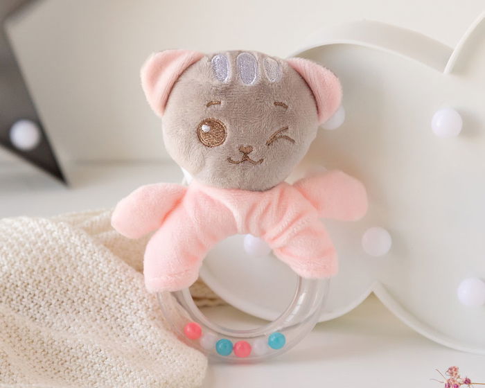 Este gatito adorable, dulce y súper achuchable ayudará a relajarse y sentirse seguro a tu bebé. es extremadamente suave, y en su parte inferior lleva un sonajero con forma de anilla que puede coger con facilidad con la mano y mover con ritmo para escuchar el sonido. es un juguete divertido y tierno, ideal para comenzar a descubrir. es de nuestra preciosa colección dolci amici. está recomendado a partir de +3 meses. - material: poliester y pp - colección: dolci amici