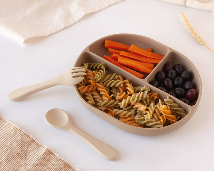 Set de cubiertos y bandeja blw en silicona con divisiones y ventosa beige