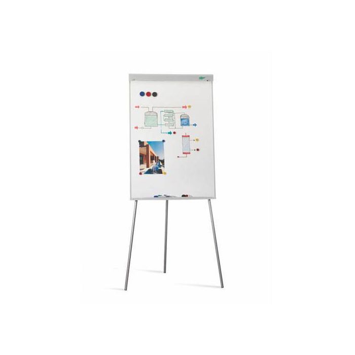 Con marco, superficie metálica, permite el trabajo con imanes, útil para colocar blocs de papel y para escribir con rotuladores especiales para pizarra blanca. Regulable en altura mediante trípode telescópico hasta 180 cm.