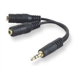 - Adaptador de audio de reducido tamaño que dispone de conector mini jack 3.5" estéreo macho en un extremo. En el otro extremo dispone de 2 conectores mini jack estéreo hembra. Duplica los canales de audio estéreo. Adaptador con conectores de plástico negro y cable en "Y" de 10 cm cada tramo.