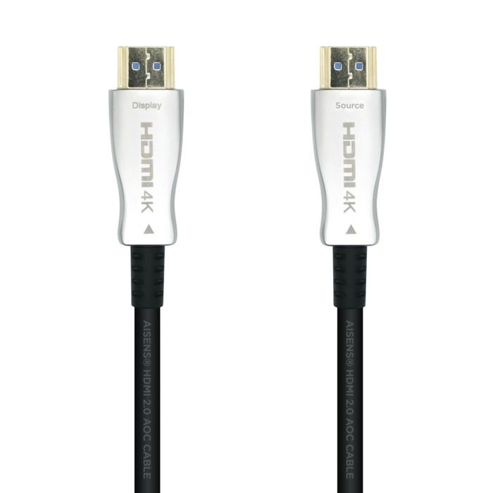 Cable HDMI V2.0 AOC premium alta velocidad con Ethernet con conector tipo A macho en ambos extremos. Fabricado con una mezcla de alambre de fibra óptica y cobre, este cable activo es menos sensible a interferencias EMI, lo cual ofrece una señal clara y fiable de audio/vídeo, incluso en entornos como centros de datos, hospitales, etc. Conectores de alta calidad blindados en oro de 24K. Múltiple apantallamiento para la máxima reducción de posibles interferencias. Fabricado con conductores de cobre (cobre OFC-Oxygen Free Copper- 99,99%) de alta calidad que garantiza la máxima calidad de transmisión. Retrocompatible con las especificaciones HDMI anteriores y funciona con todos sus dispositivos HDMI existentes. Ancho de banda hasta 18Gbps. Soporta RGB 4:4:4 HDCP2.2 Soporta resoluciones de vídeo
