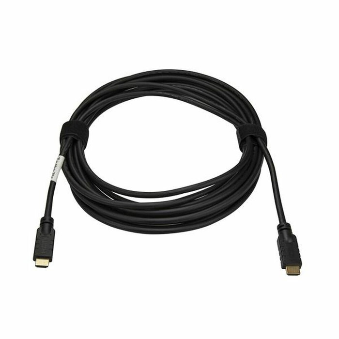 El cable HDMI Startech HD2MM10MA es un cable HDMI activo de 10 metros diseñado para proporcionar una transmisión de señal de alta calidad en instalaciones que requieren conexiones HDMI a larga distancia sin pérdida de calidad. Su diseño unidireccional cuenta con un amplificador de señal integrado que potencia la señal HDMI sin necesidad de alimentación externa, lo que permite alcanzar distancias que superan las capacidades de un cable HDMI tradicional, ideal para conexiones de hasta 10 metros entre dispositivos con puertos HDMI. Fabricado en color negro con un recubrimiento de PVC y protección con papel de aluminio, este cable también está certificado con la norma CL2, lo que lo habilita para instalaciones empotradas en pared garantizando seguridad y durabilidad. Dispone de conectores estándar HDMI tipo A, ambos de género macho con contactos chapados en oro que aseguran una excelente conductividad y resistencia a la corrosión, compatible con la versión HDMI 2.0, lo que permite soportar resoluciones hasta 4K a 60 Hz (3840x2160p) y un ancho de banda de hasta 18 Gbps. Además, soporta contenido en formato HDR (High Dynamic Range), ofreciendo mayor rango dinámico y colores más vivos, así como hasta 32 canales de audio digital sin compresión para un sonido de alta fidelidad. Su estructura con alambre delgado y flexible facilita la instalación en espacios reducidos o en paredes, manteniendo la integridad de la señal en entornos profesionales o domésticos. Es importante respetar la dirección unidireccional del cable, conectando el extremo marcado como “TV” directamente a la pantalla para asegurar el correcto funcionamiento. Este cable HDMI de Startech representa una solución técnica avanzada y fiable para quienes exigen conexiones de alta calidad en sistemas audiovisuales de larga distancia, combinando robustez, compatibilidad y rendimiento en un único producto.