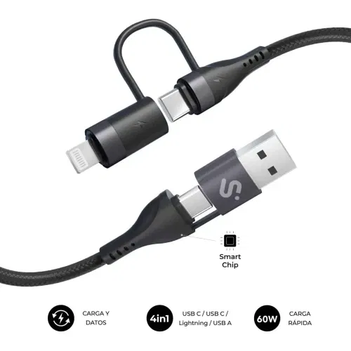 SUBBLIM TOP Cable 4 en 1 (USB-A/C-C/Lightning) 1 m – 60 W PD 3.0, 480 Mbps, Nylon Trenzado, Carga Rápida iPhone/Galaxy/Pixel/MacBook.