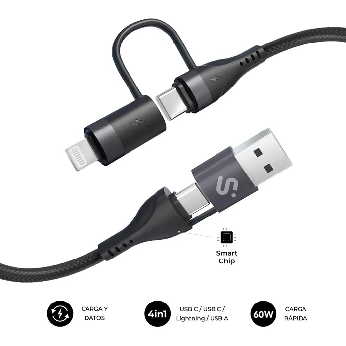 El SUBBLIM TOP 4 in 1 combina los cuatro conectores más usados (USB‑A, USB‑C y Lightning) para que cargues y sincronices prácticamente cualquier dispositivo actual sin cargar con varios cables.