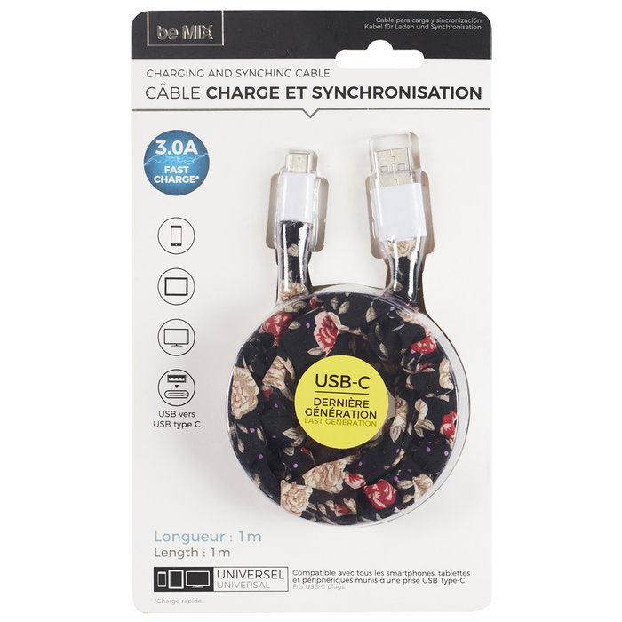 Be Mix Cable USB Tipo C Carga Rápida 3A con Recubrimiento de Tela Estampada Floral 1 Metro