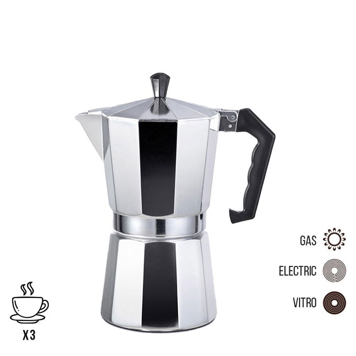 Cafetera de aluminio 3 tazas. apta para gas, vitroceramica y placa electrica. fabricada segun normativa ue de productos en contacto directo con los alimentos