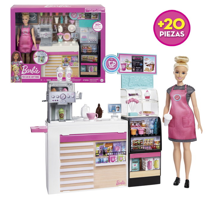 ¡Explora todo un mundo de diversión en la cafetería con el conjunto de juego de Barbie Cafetería! Si te gusta preparar café y batidos, ¡te encantará la cafetería! El conjunto de juego de Barbie Cafetería incluye una muñeca Barbie con una camiseta adorable a rayas blancas y negras, un delantal rosa y el pelo recogido en un moño. ¡Barbie está lista para atender a los clientes! La cafetería cuenta con una pizarra de menú y una cafetera para preparar café, batidos y té (gira la rueda de la cafetera para elegir la bebida que quieras). Entre los accesorios adicionales se incluyen una jarra de leche, sirope de chocolate, tazas para el café, vasos para los batidos, una taza para el té y mucho más. También incluye una sección de dulces con pasteles, una magdalena y galletas, una sección de artículos fríos con 2 botellas de agua, y una sección de tentempiés que incluye una barrita energética. Cuando el cliente haya decidido su pedido, Barbie puede apuntarlo en la caja registradora. El conjunto de juego de la cafetería incluye más de 20 piezas para contar historias (algunas tienen una anilla con clip para que Barbie pueda agarrarlas). A las niñas les encantarán las infinitas posibilidades de expresarse creativamente y divertirse en la cafetería. Es un regalo fantástico para niñas a partir de 3 años, especialmente para las que adoran preparar café, servir comida y aprender a cocinar. Las muñecas no pueden tenerse en pie por sí solas. Los colores y la decoración del juguete pueden ser distintos de los mostrados.