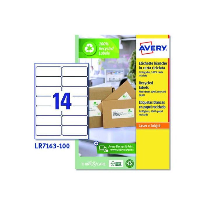 Avery LR7163-100 Caja 100 Etiquetas Blancas Recicladas QuickPeel para Láser 99.1x38.1mm 14 Etiquetas por Hoja