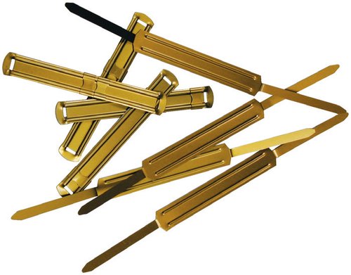 Encuadernador fástener fabricado en metal muy resistente con un tono metal dorado. Disponible en caja 50 unidades.