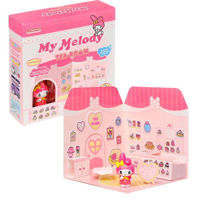 ¡Mi Melody en un pintoresco salón de té! Cada set de casas de pegatinas incluye una figurita de vinilo y una escena única para decorar con un surtido de coloridas pegatinas. Perfectas para el bricolaje, para jugar o como objetos de colección, estas casas de pegatinas son una deliciosa combinación de creatividad y diversión.