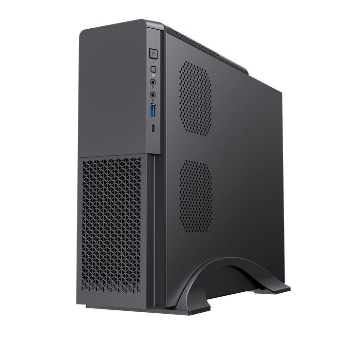 Caja micro ATX con diseño compacto de Phoenix para PC en formato SLIM y con frontal acabado elegante en brillo y una fina linea plateada.