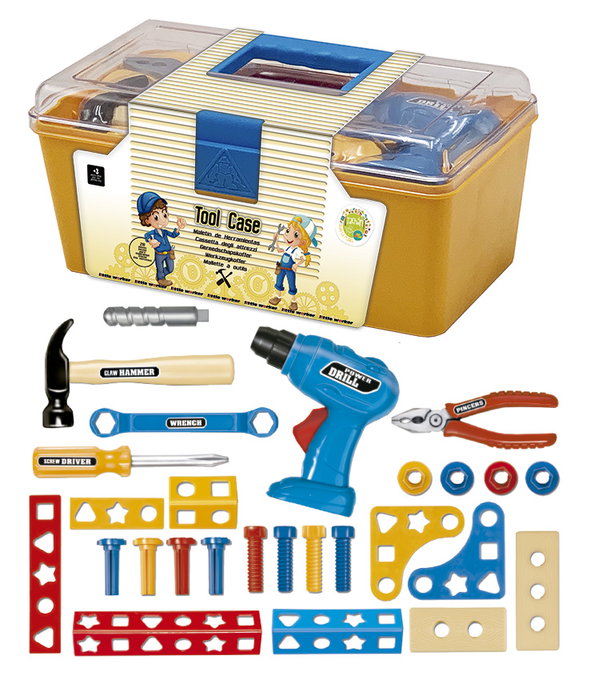Maletín de herramientas en caja cerrada de 28 piezas, contiene taladro, broca, alicate, martillo, llave, destornillador, 9 piezas de ensamblaje, 4 remaches 4 tornillos y 4 tuercas. Muy facil de guardar y transportar.