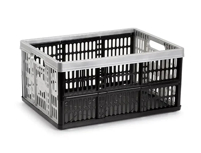 Caja plegable de plástico color plata. Fabricada en España. Soporta hasta 18 kg y es ideal para transportar materiales. Su diseño plegable permite ahorrar espacio al guardarla.