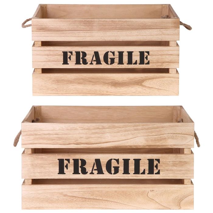 - Set de 2 cajas de almacenaje de madera natural con la palabra Fragile.