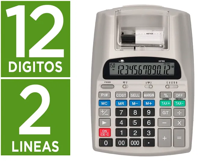 Calculadora impresora con pantalla de 12 dígitos. Utiliza rollo de papel de 57 mm de ancho por 25 mm de diámetro. Impresión en 2 colores. Con tecla de memoria, redondeo, tecla doble cero y triple cero, tecla programable de impuestos, margen de beneficio, precio de coste y precio de venta. Funciona con 4 pilas AA. Pilas incluidas. Medidas: 225 x 158 x 56 mm. Peso: 490 g.