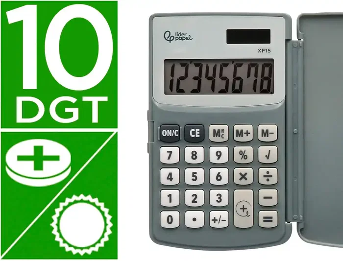 Calculadora de bolsillo de 10 dígitos. Tecla de encendido. Funciones de raíz cuadrada, porcentaje, suma y resta de memoria. Solar y a pilas. Utiliza pilas LR1130. Con tapa rígida. Color gris. Medidas: 123 x 75 x 12 mm. Peso: 105 g.