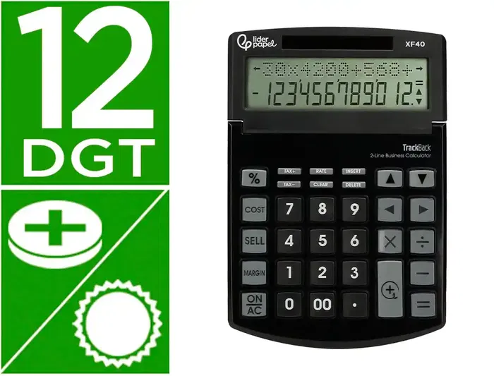 Calculadora de sobremesa de 12 dígitos. Fabricada con un 40% en plástico reciclado, respetuosa con el Medioambiente. Pantalla reclinable de doble línea. Con función Trackback. Teclas de coste, ventas y margen de beneficio.Tecla de cálculo de impuestos. Tecla de doble cero. Tecla de inserción y borrado. Elegante frontal metálico de color negro. Teclas de plástico. Pulsación de rápida respuesta. Autoapagado. Medidas 175x120x30 mm. Solar y piLAS