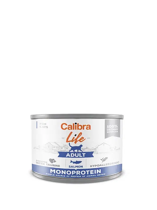 Calibra Cat Life en lata es un alimento húmedo para gatos adultos. Presentado en un práctico pack de 6 latas de 200 gramos, cada una con una deliciosa receta de salmón, perfecta para satisfacer los paladares más exigentes de tu felino.