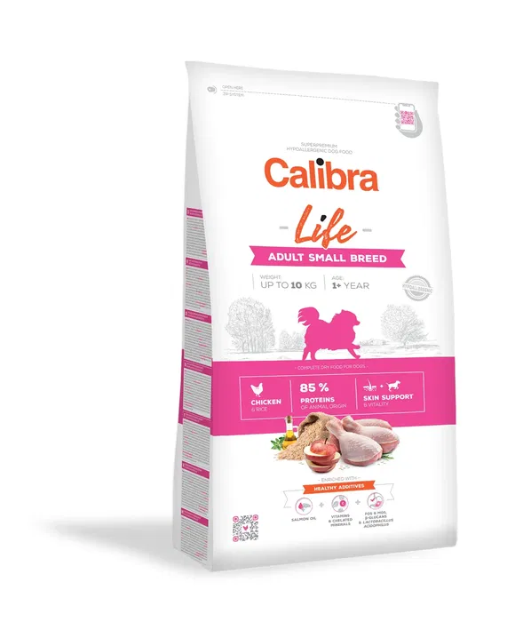 Alimento completo hipoalergénico Calibra para perros adultos de razas pequeñas. Formulado con una única fuente de proteína (pollo) y bajo contenido en cereales (solo arroz) para favorecer una digestión sensible. Enriquecido con aceite de salmón, que ayuda a mantener una piel y un pelaje saludables.