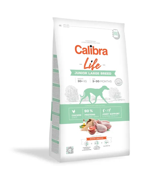 Calibra presenta su alimento completo hipoalergénico específicamente formulado para cachorros junior (de 3 a 30 meses) de razas grandes, que superan los 30 kg de peso adulto.