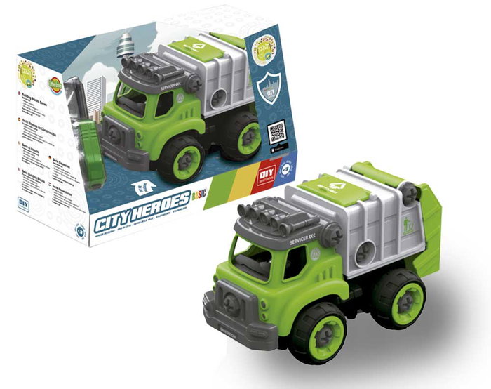Camión de la Basura desmontable. Compuesto por 27 piezas. Se presenta montado y con un destornillador para poder sacar, ajustar o cambiar las piezas. Presenta instrucciones de montaje y existen 4 modelos más para coleccionar. Tiene sonidos y funciona con pilas. Recomendado para niños mayores de 3 años.