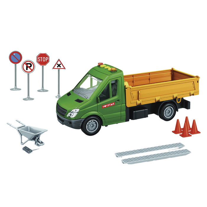 Camion con señales de tráfico de escala 1:!4 con grandes acabados. Combina el plastico y la goma para numerosos detalles. Es funcional y además posee luz y sonido. No recomendado para menores de 3 años.